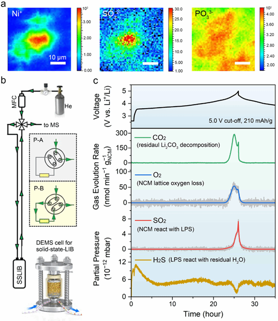采用飞行时间二次离子质谱(ToF-SIMS)对基于Li7P3S11(LPS)的SSLIBs进行固态副产物测量,表明主要固态副产物是亚硫酸盐和亚磷酸盐(图1a)。为测量SSLIBs的气态副产物演化行为,作者原创性的设计了如图1b所示的气路和固态电池产气测试模具。其测试结果如图1c所示,主要副产物为H2S、O2、CO2和SO2