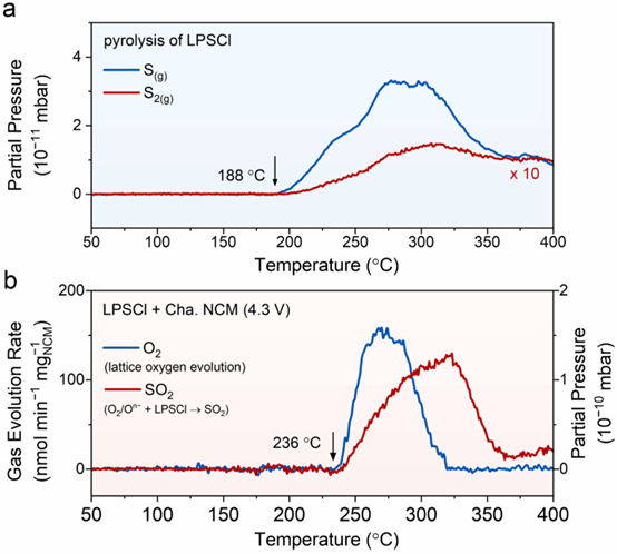 图5a 纯LPSCl的实时气体逸出分析。 图5b LPSCl与NCM811组件的实时气体逸出分析。NCM充电至4.3 V(vs Li+/Li),电流速率为0.05 C(1 C = 210 mA/g NCM)。在热失控的条件下,固化物基全固态锂离子电池依然会产生大量的有毒SO2气体和Sx,表明硫化物基全固态电池也并非是传统意义上的绝对安全。