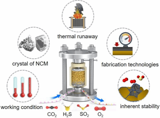 本文通过原位电化学差分质谱技术(DEMS)深入研究了使用高镍正极材料的硫化物基全固态锂离子电池(SSLIBs)在电化学过程和热失控过程中的气体演化行为,揭示了硫化物电解质本征稳定性、工作温度以及电池制造参数(压力和正极材料形貌)对于固-固界面降解的影响。研究发现,在电化学循环过程中的主要气态副产物是H2S、O2、CO2和SO2。热失控条件还会额外生成硫的同素异形体(Sx),这挑战了硫化物基系统绝对安全的传统假设。