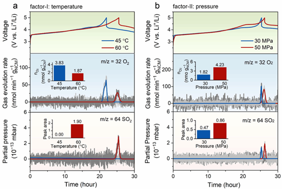 图3a 在不同温度(45℃和60℃)下的恒流充放电曲线及对应的实时气体逸出行为;插图是O2的总量和SO2的峰面积。图3b 在不同制造压力(30 MPa和50 MPa)下的恒流充放电曲线及对应的实时气体逸出行为;操作温度为60℃,插图是O2的总量和SO2的峰面积。