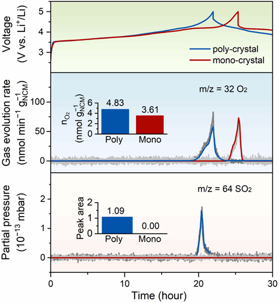 图4展示了使用单晶或多晶NCM811时的恒流充放电曲线及对应的实时气体逸出行为,操作温度为60℃;插图是O2的总量和SO2的峰面积。所有电池均以0.05 C(1 C = 210 mAh/g NCM)的电流速率操作。通过对比高镍正极的不同形貌表明,单晶NCM811可以有效抑制SO2演化,而使用多晶NCM811正极的SSLIB中依然存在明显地SO2演化。